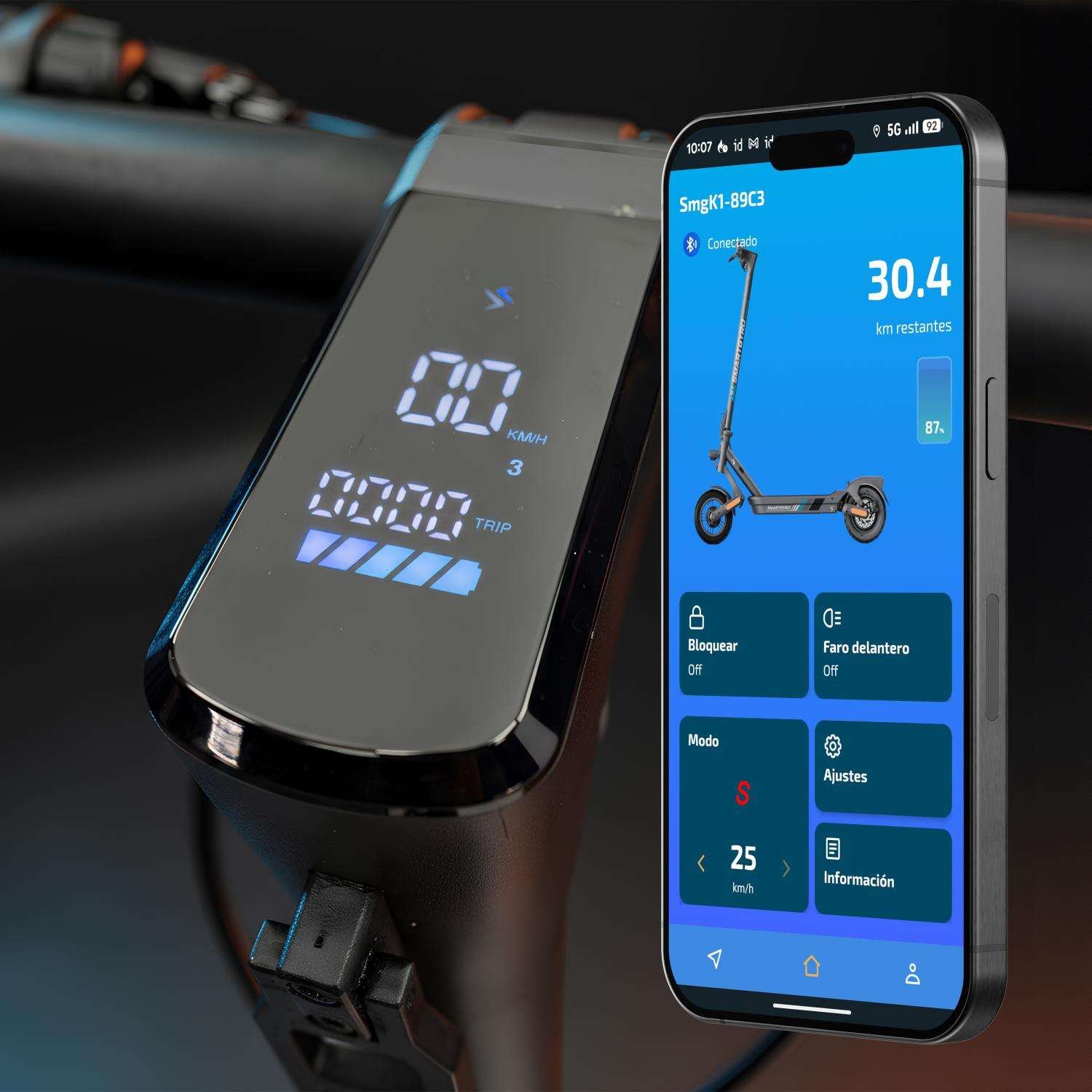- APP Smartgyro Core: Controla tu patinete desde el móvil con funciones como bloqueo a distancia, seguimiento de kilometraje, estado de la batería y más.